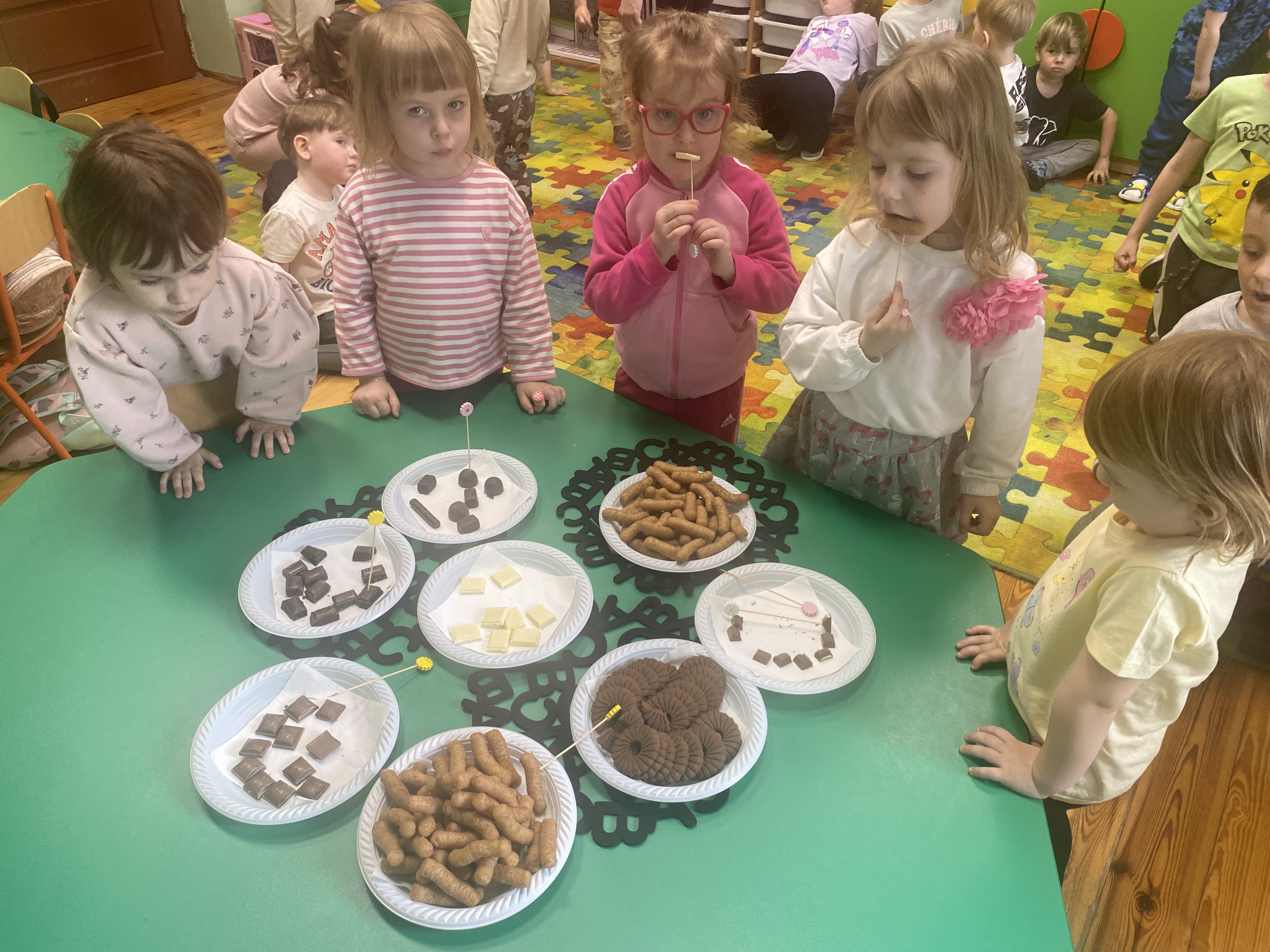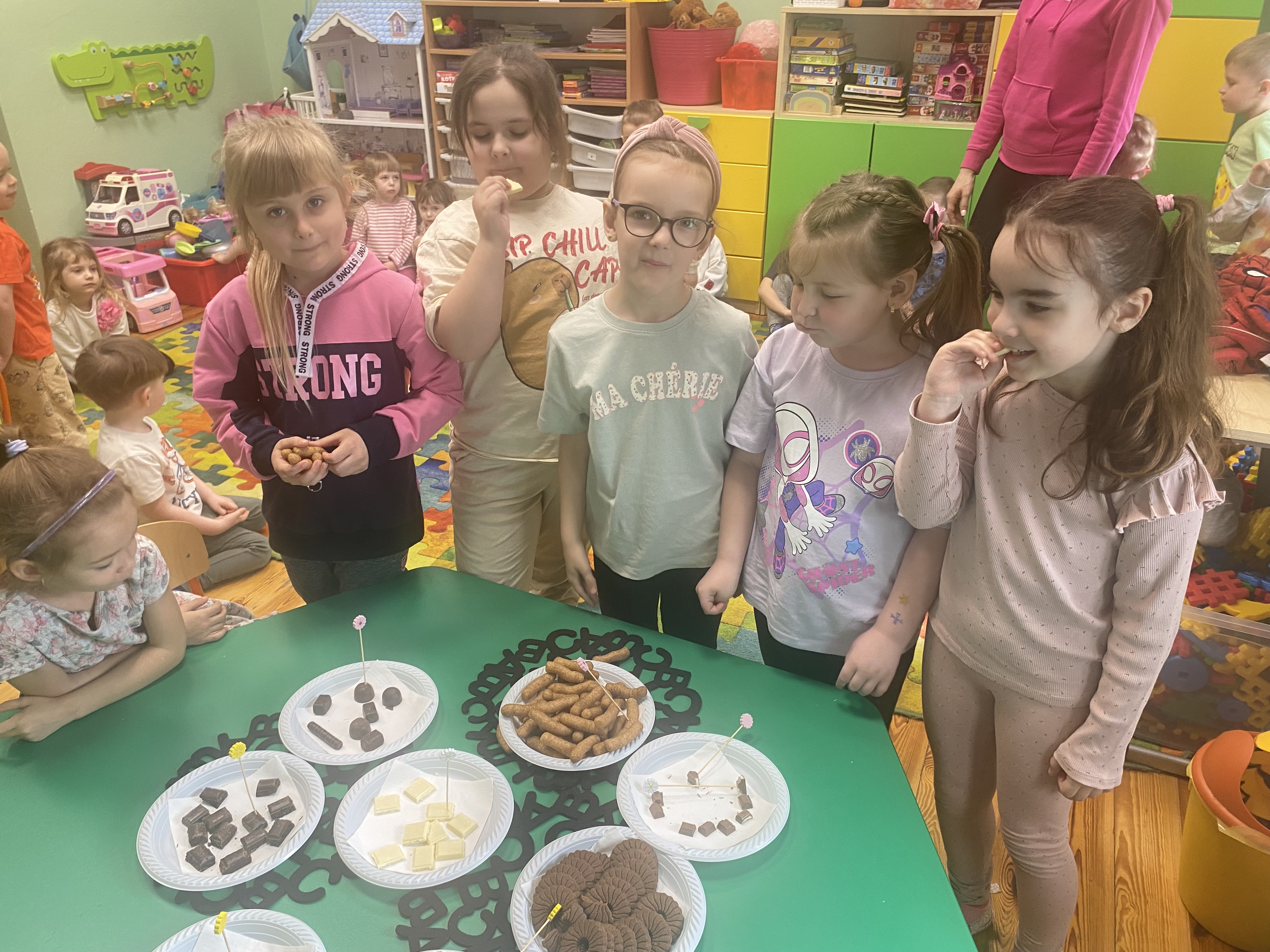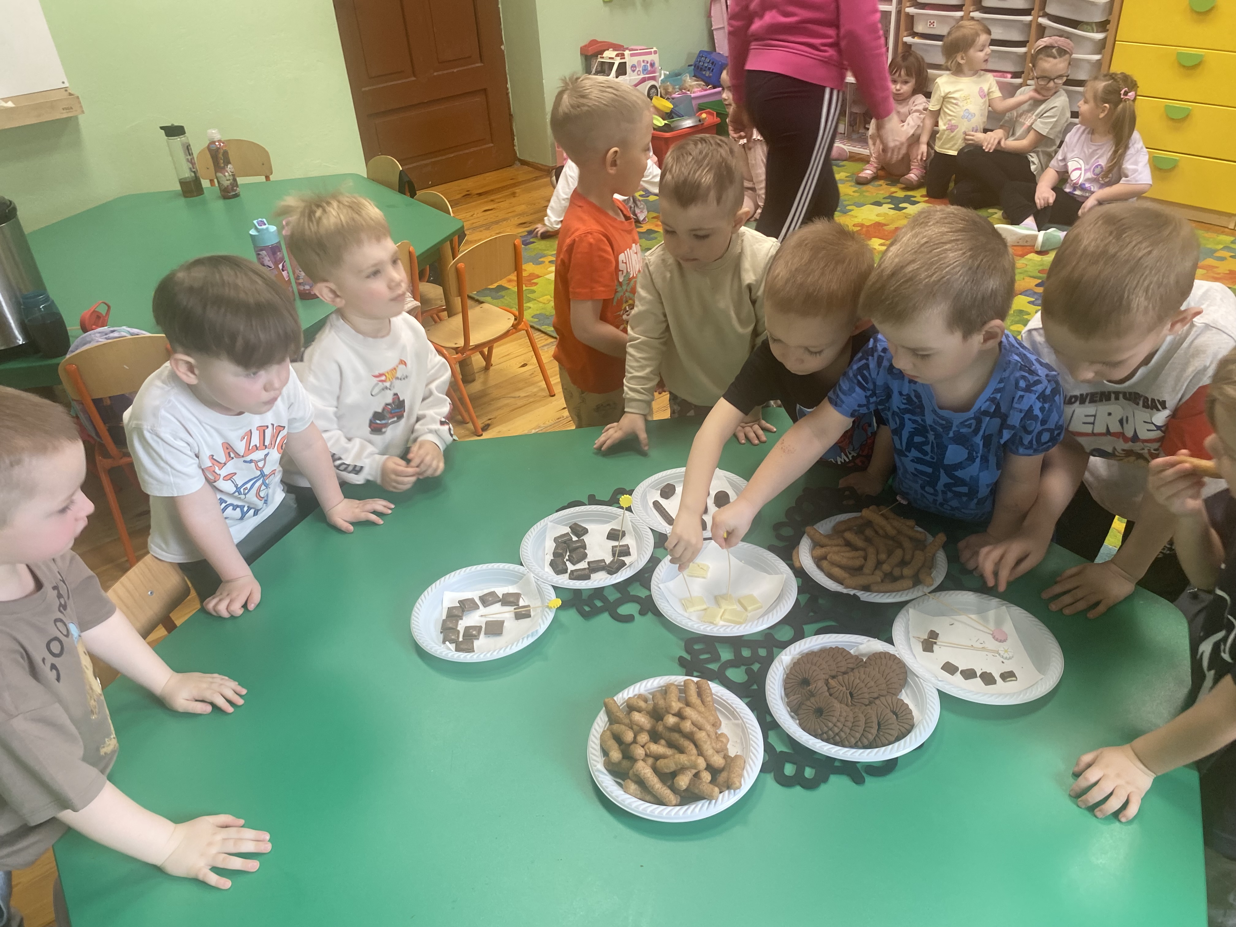 Tematyczne zajęcia pozwoliły dzieciom poznać pochodzenie tego słodkiego przysmaku, rozwijać wyobraźnię i kreatywność oraz uczestniczyć w zabawach sensorycznych.